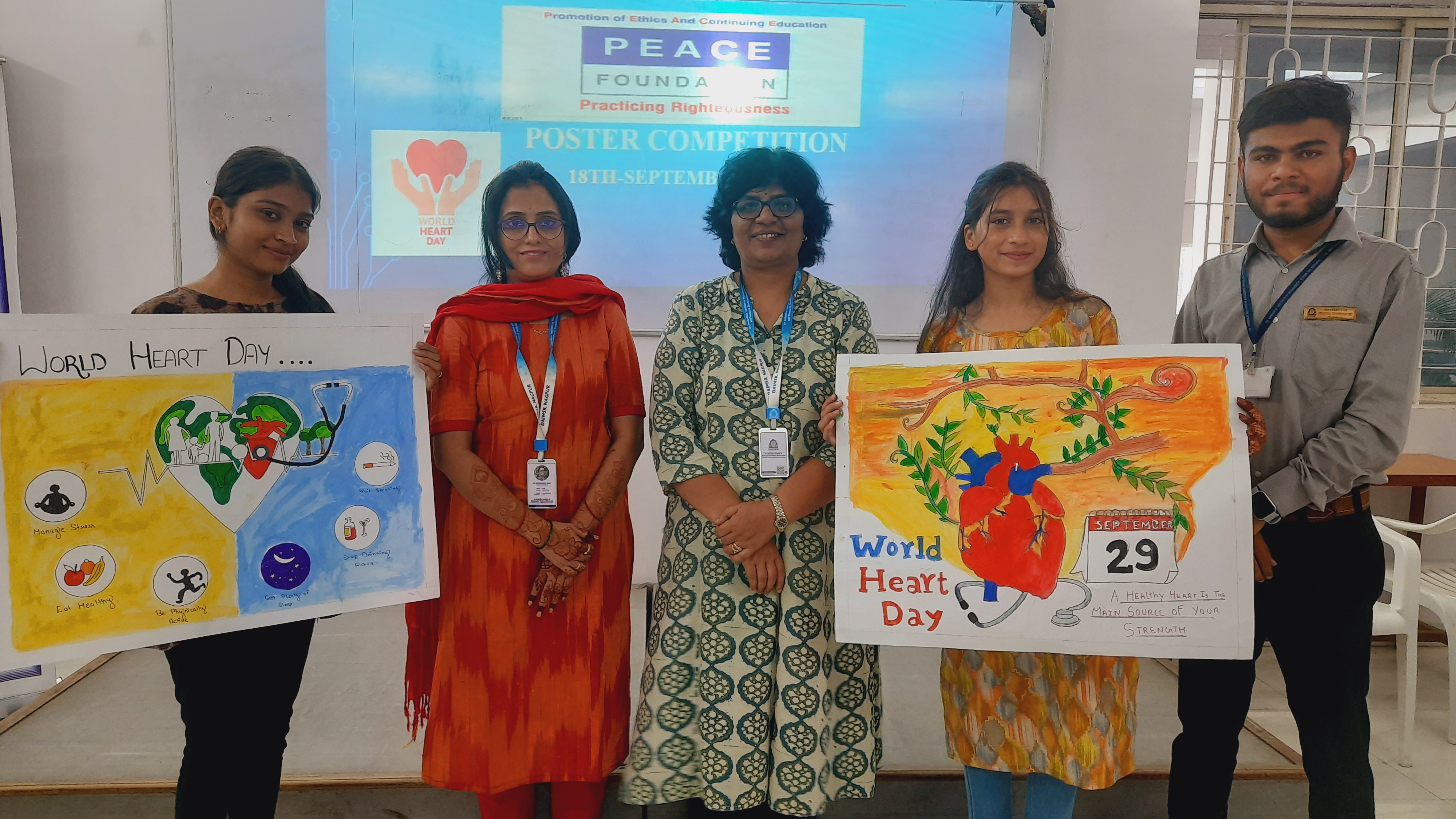 BCCA department, DAIMSR in association with Peace Foundation embraced the spirit of World Heart Day by hosting a remarkable poster drawing competition on September 18, 2023. The event not only celebrated the significance of a healthy heart but also conveyed the message that taking care of one's heart is paramount. The competition was conducted under the esteemed association of the Peace Foundation, an organization dedicated to fostering peace and well-being in our society. A total of 29 enthusiastic and talented students participated in this inspiring competition and brought their unique perspective and artistic skills to the canvas.